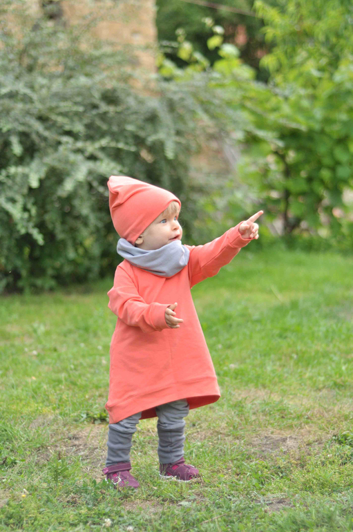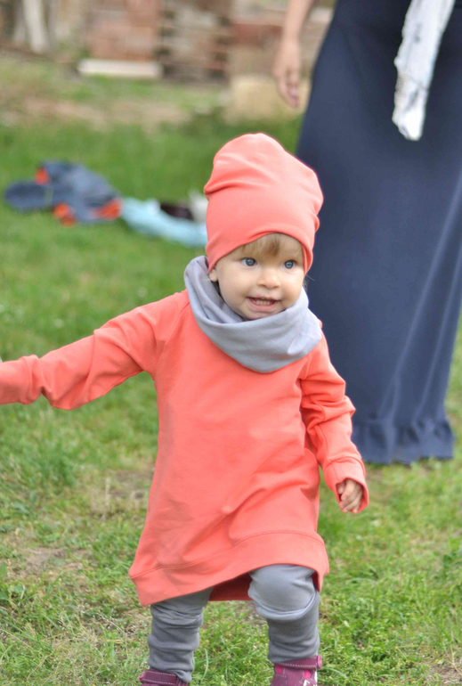 Туника на младшенькой пока как платьице. Штанцы с запасом довольно большим. На этих фотках не сообразила подвернуть манжеты, весь запас умудрился спрятаться выше под туникой :)