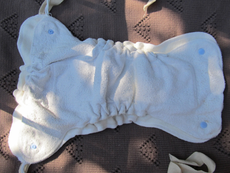 Сама ткань подгузника очень износоустойчива. На подгузе за два года - ни одной дырочки! Только повязки истрепались. Вместо них просто поставила еще пару кнопок.