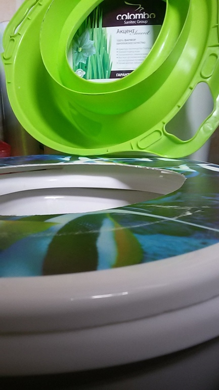 7. Ну и последнее, что у меня есть. Это сиденье на унитаз для среднего ребенка. Это сиденье так сильно смещалось, когда ребенок пытался на него сесть, что мы его отложили. Потом придумали купить недорогое сиденье с плоской крышкой. В самой крышке сделали вырез точно ,чтобы детское сиденье вставлялось плотно. Теперь ребенок сам устанавливает его и садится.