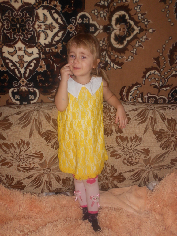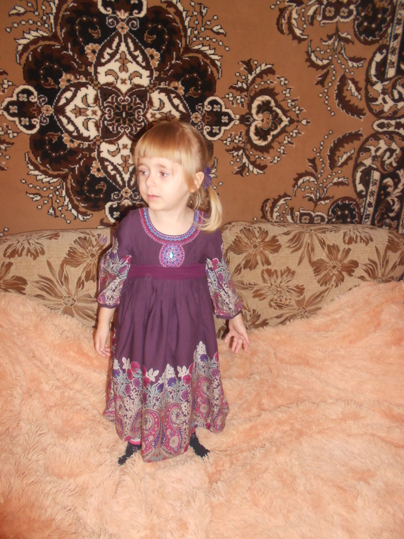 Платье размер 4-5, на наш возраст 2,5 конечно велико, пусть полежит, у нас пока платьев много. Папа сказал цыганка.