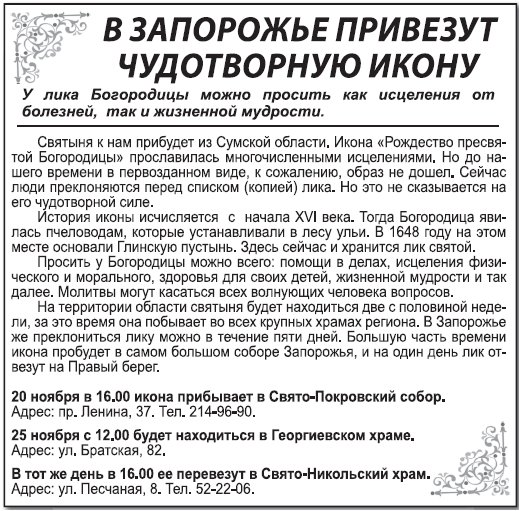 График пребывания православных святынь в Запорожской обл. (Украина)