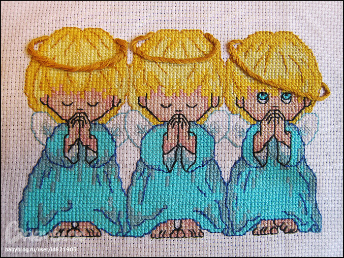 Вот у всех эти ангелочки по-разному получаются. Индивидуально))) У вас они такие скромняшные... Такие глазюки - что угодно выпросят) Желаю побыстрее увидеть результат // жирные! А я все никак вышить немогу - вышиваю подбором, очень уж дефицитный набор) То не нравится цвет, то стежки не ложатся. Даже печально. Но я упорная! Добью!