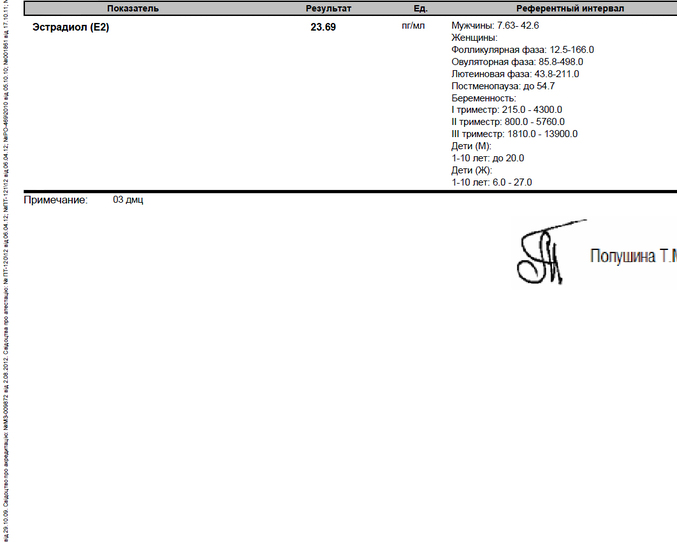 Эстрадиол в норме, но ближе к нижней границе, по идее он к овуляции должен еще подняться. Но все же надо у врача спросить, вдруг надо его поднимать. Он влияет на прикрепление яйцеклетки к стенке матки.
