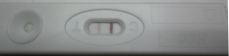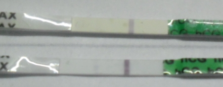 дешевые (китайские) тесты с чувствительностью 25 показывают слааааабый призрак (сверху - задержка 6 дней, снизу - сегодняшний, задержка 8 дней) - и даже сегодня еле-еле видно :(