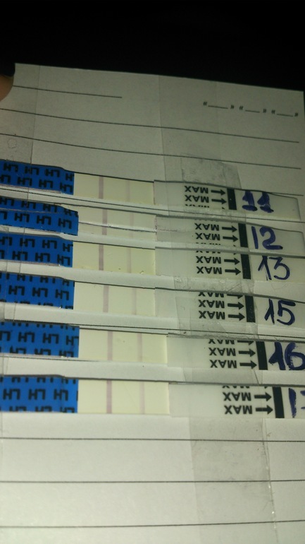 на утрике до этого был 27-28 дней, а в этом цикле все отменила,поэтому не знаю какой цикл будет..но на 16 д.ц.пока не высох, прям почти одинаковые были...я просто читала,что тесты и с чувствительностью разные, ну завтра еще сделаю..