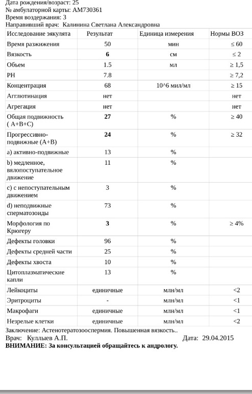 Напомню, вязкость была 8, снизила ь немного совсем. После начала лечения прошел месяц. Некоторые показатели даже ухудшились....активность немного снизилась. В четверг пойдем к врачу. Нам поставили хронических простатит, прошли курс массажей и физио, антибиотики, витамины, свечи, уколы...но пока все не очень... Если можете что посоветовать буду признательна...