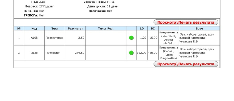 Пролактин пересдавала, так как ночью перед анализами первый раз практически не спала, переживала, поэтому я думаю это отразилось на результате, ведь на 21 дц он в норме