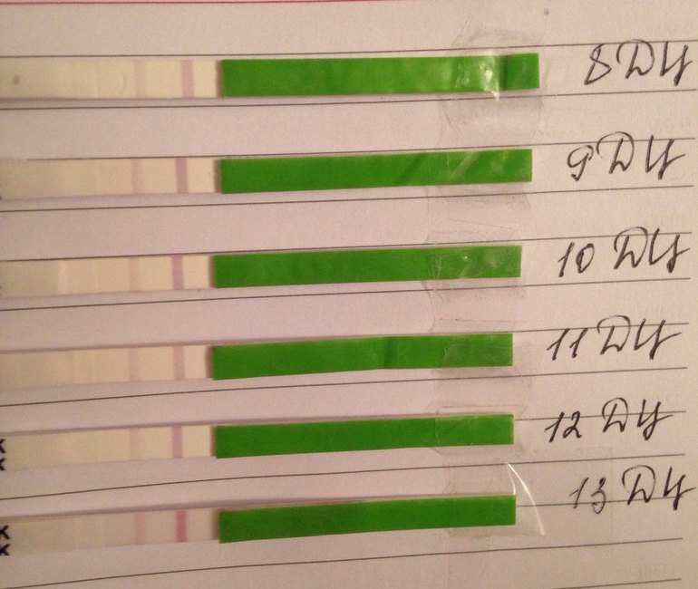 Вот, у меня такая же картинка по тестам))) думаю придётся вторую пачку покупать, чтобы поймать))) полосочки не дотягивают до контрольной, но и не тусклые, скорее бы уже)))) вообще 12 д.ц., почти в ногу идём)))