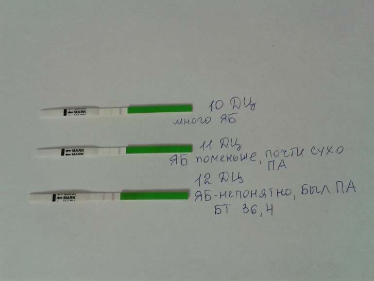 К вечеру 11дц Яб почти пропал и тест побледнел. А сегодня опять ярчает! С Яб непонятно,тк па два дня подряд, уже не разберешь, что там. Бт 36,4. Так О была или нет?