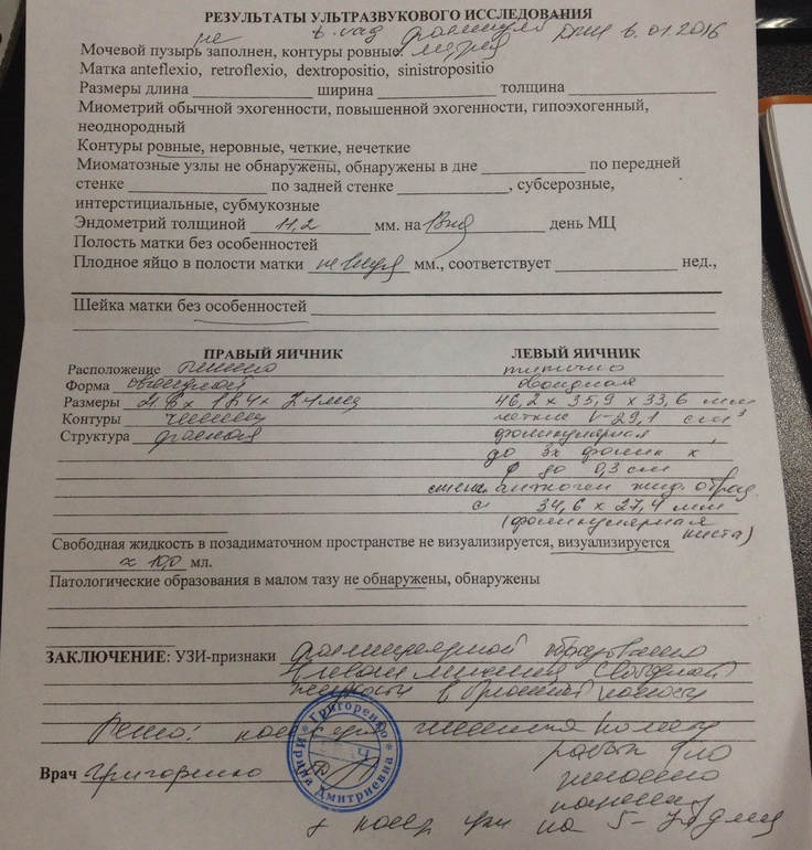 ФолликулометрияСходила на фоликулометрию, посмотреть лопнул ли фоликул, который в субботу был 23,9 и тест на О то-же был положительный в тот день, хотя БТ странно себя вела, как в первой фазе, сходила сегодня и ужаснулась, фолик размером 34.6х27.4 Это уже фолликулярная киста и он вырос с 23,9 до 34.6 буквально за 2 дня. Хотя есть жидкость позади матки и узистка предположила, что может надорвалась оболочка, но сомнительно. Врачу своему не дозвонилась. Вот узи, может кто что подскажет.