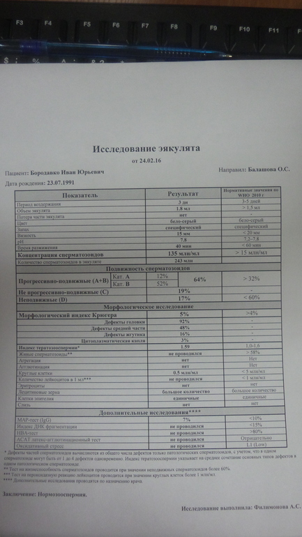 ,спасибо, делаем этот анализ на протяжении ...лет . И вот замечаю, что поменялся уровеь нормы с 20-30 % (в разных хороших лабораториях) нормальных форм стало 4% :( вот и думай что хочешь :( "я сразу хочу расставить все точки над i. Те показатели, что вы видите в рекомендациях от 2010 г., рассчитаны на протокол ЭКО" ну вот, всё как то прояснилось. у нас как рз 2 -4 % этих самых нормальных форм ..
