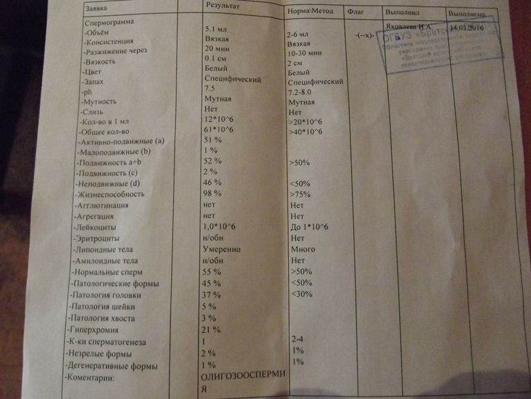 у него было варикоцеле 3 степени. по СГ не могли даже морфологию определить, т. к. не было спермиев вовсе. Сделали операцию по удалению варикоцеле в сентябре 2015. Через 3 мес опять СГ, было уже лучше 5 млн/мл. После стал пить просто комплекс витаминов и диета. Ну вот эта последняя СГ вот такая.