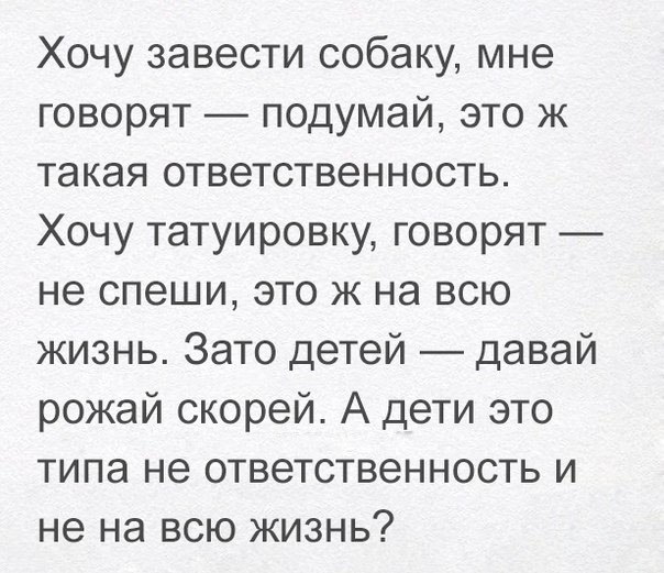 точно же!!! Хочу отвлечься собаку завести мне сказали что это такая ответственность животное дома!!!! Но зато ребенка все уже прям все давай заводите уже!!!