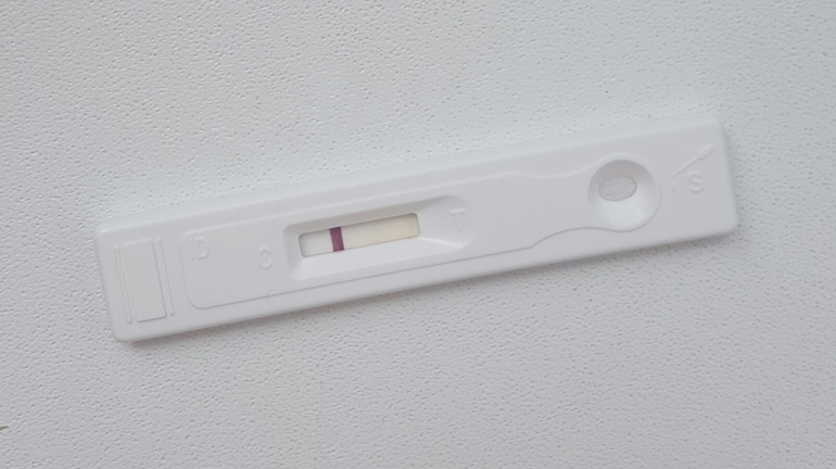 что то есть, оч слабо, можно сказать нет...купите тест другой фирмы, этот может выдавать реагента, я как то лично таким тестам не доверяю. Евик самое то!