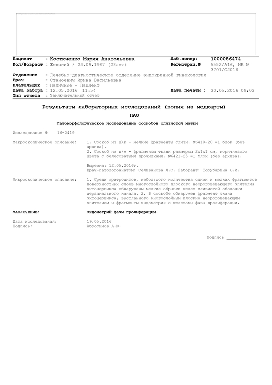 В общем наконец забрала я гистологию... И совсем запуталась. Все в порядке. Нет эндометрита и про полип тоже не написано... Позвонила ординаторше, спросила а был ли он вообще. Сказала спросить у врача. Сказала, что судя по заключению все там хорошо. А если что то и было то убрали =/ короче я запуталась.... И теперь не знаю почему я все еще не Б, если полипа не было. И был ли он вообще. Потому что в заключении в больничном указано про удаление полиповидного разрастания. Короче кроме СПКЯ (с периодическими овуляциями) и небольшого эндометриоза у меня больше ничего плохого нет. Буду считать, что Б не получалась из-за фоликов переростков (перезрелость Я) и недостаточного эндометрия. Других причин я не вижу...
