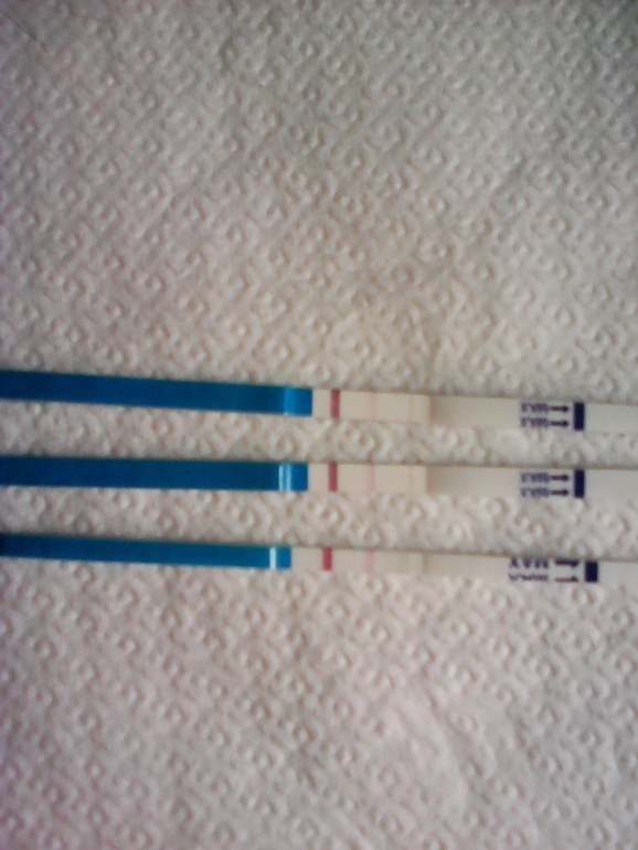 Посмотрите пожалуйста. Сверху вниз 12 дпо утро, 13 дпо утро (эти два с чувствительностью 10), 15 дпо день - сегодня должны бы были пойти месячные (чувств. 20 "Будь Уверенна"). Не слабенькие ли полоски? Мне кажется медленно ярчают(![]()