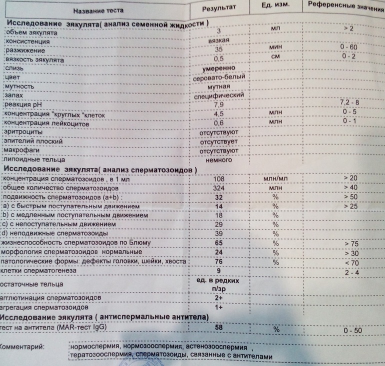 Не вижу значения по лейкоцитам. Думаю, ничего критичного, просто нужно к урологу-репродуктологу. Снижена подвижность, возможно на фоне агглютинаций и воспалительного процесса. И МАР тест высокий. Спросите у врача про анализ Антиспермальный антитела. 2-3 месяца полечите мужа и все прийдет в норму.