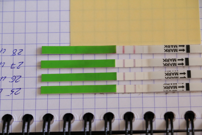 последний тест еще мокрый. Я еще сделала фото в перевернутом виде, мне кажется как-то лучше понятно какой из них ярче. Я была уверена, что 25 были самые яркие и они в мокром виде сравнялись. Но потом 27 числа снова яркие и тестовая полоска в мокром виде ярче контрольной, вот я и запуталась