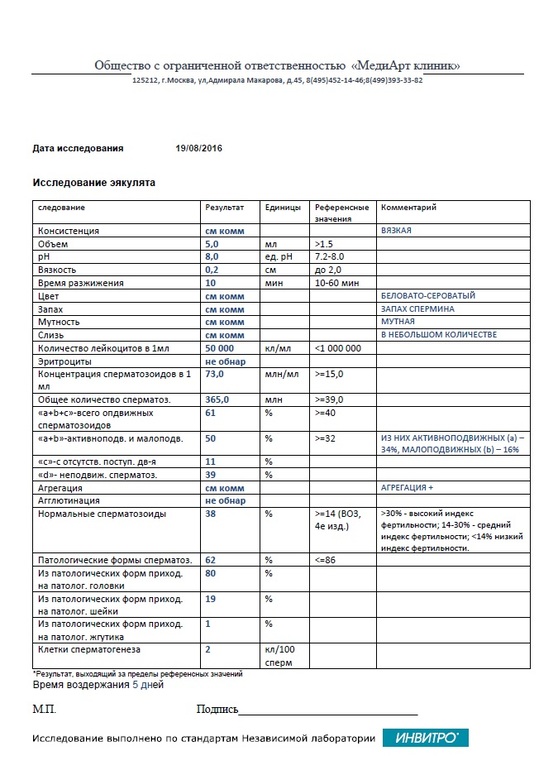 Насколько мы сами поняли, папа у нас очень даже ничего))) Немного смущает комментарий "Агрегация +", это вроде как не очень хорошо. И хотелось бы уточнить по поводу рН, который у нас на верхней границе, и времени разжижения (на нижней).
