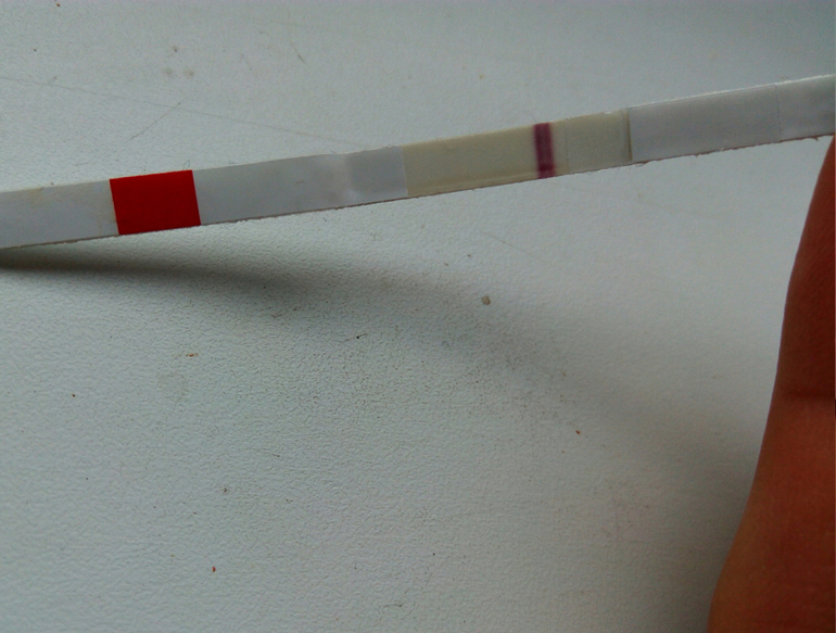 Сегодня с утра я его замочила, всё строго по инструкции. Сперва тест был полностью чистый. Потом появилась яркая и сразу видно стало ещё одну, того же цвета, но гораздо светлее. Всё это произошло не позднее 5 минут. После 15 минут полоска стала гораздо светлее, чем была сначала. (Фото без затемнения).