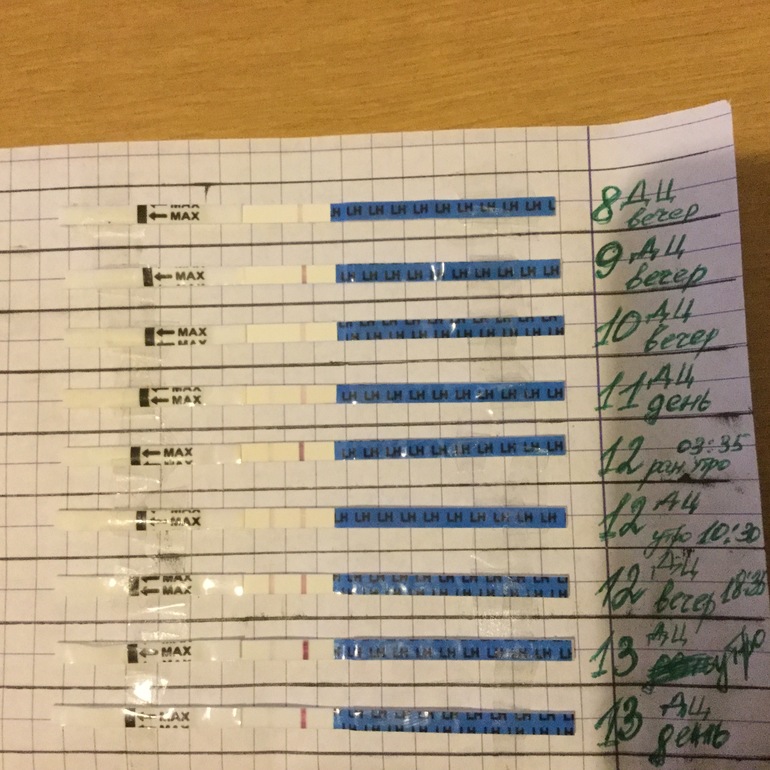 А у Вас на 12 день вечером такая же полоска была как на фото? Она не побледнела? Просто у меня она была очень яркая и держалась сутки (я тоже утром и вечером делала эти же тесты), но на 18 день, а на 12-13 такая же бледненькая была( Но если у вас это и был пик выброса гормона, то овуляция через 24 - 36 часов наступит, а тогда и оплодотворение))) Давайте дерзайте)) и следующие тесты выкладывайте на беременность