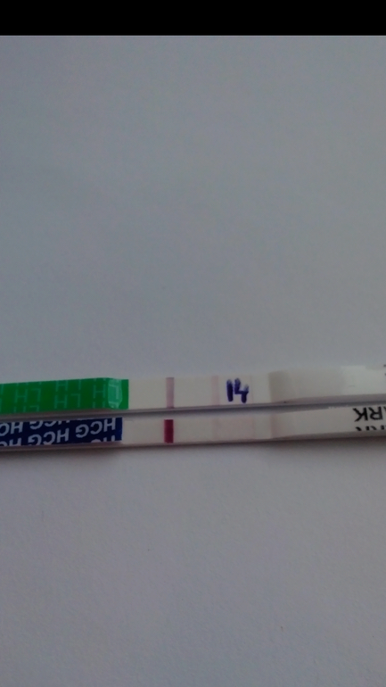 День Х наступил!Я вот думала почему именно мне каждый месяц тесты рисуют слабые еле заметные полоски в конце цикла на 10,11,12 дпо, а на 13 и 14 обычно пусто, не может же у меня каждый цикл быть бхб, я склоняюсь что мои небеременные тесты реагируют на лг, он у меня почему то повышается к концу цикла, раньше я не знала, а последнее время стала мочить в конце цикла тесты на овуляцию,и они рисуют полоски не жирные, но довольно яркие, в этом цикле я когда ловила овуляцию на 14 д.ц полоска была более менее яркая, но не пик и вместе с ней я замочила тест на беременность и на нем вылезла бледная полоска, среагировал, так вот в конце цикла у меня похожие полоски на овулю, они не пропадают никогда полностью, ближе к месячным только совсем слабые становятся, 1) фото на 14 д.ц 2) фото 10,11 дпо цвет чуть бледнее кажется,так как фоткала уже сухие
