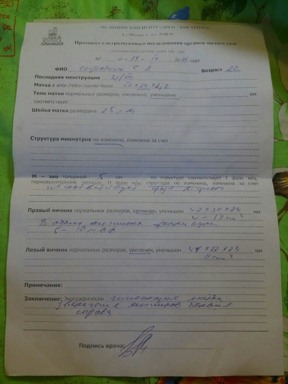 Но т.к работа непозволяла дойти до врача, то пока ворона в попу не клюнула, а точнее на 28 д.ц началась мазня, совершенно несхожая с месячными, скудная, и скорее выделеения яб с примесью крови по пол ежтиденвки шла 5 дней... Я бы соверешенно не назвала это месячными, потому побежала к врачу! узи на 31 д.ц в арго ( врач мужчина в возрасте, фамилию незапомнила, в выписке ненаписано)