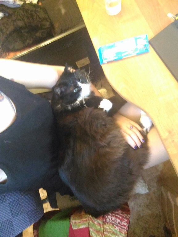 Он уже второй день как только видит меня, ложится мне на пузо) Если я на боку, то под поясницу подкладывается, если за столом, на коленки лезет, даже если просто иду по квартире, бегает за мной и просится на ручки!
