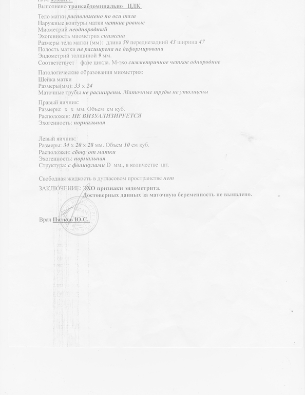 11.02. были предпоследние М. цикл всегда был ровный 28 дней,тоесть следующие должны были начаться 11.03(это с учетом того что в феврале меньше дней).В итоге М начались с задержкой 13.03 да и были они не обильные как всегда,а просто мажущие,при чем с тянущими болями(в тот же момент тесты слабо полосатили,да и все признаки Б были на лицо).Муж потащил меня в больницу так как мы очень хотим ещё ребеночка,он испугался наверно больше чем я.В больнице сделали мне узи где Б не увидели,но зато увидели ЭНДОМЕТРИТ-воспаление матки,врач прописал метронидазол и амоксицилин+иммуномодулятор+успокаивающие,так же сказала на 5 дц сделать повторное узи. Повторное узи меня вообще расстроило так как вместо эндометрита признали воспаление единственного яичника(при чем яичник как выразился другой врач был прямо огромных размеров)+ещё и миому обнаружили.Врач сказала надо опять сделать узи через 10дней. Естественно все эти дни я на нервах от не поняток что со мной происходит,я не вытерпела и пошла на узи 22.03,узи трансвагинальное.Принесла туда заключения предидущих узи и врач начила искать все эти болячки у меня.Смотрела очень долго,в итоге яичник был в норм состоянии матка так же,миомы она сказала и подавно нет,есть не большие эхо признаки эндометриоза(но как она сказала скорее всего это не большие спайки).Так же с её слов это 10дц,имеется шикарный ДФ и эндометрий.Говорит всё подготовленно к зачатию,так что сношайтесь как кролики и будит вам бебик))))))).А вот вчера ближе к вечеру пошла я на попис и когда вставла почувствовала что мне что то мешается,смотрю а там прозрачные сопли тянутся,я попробывала их убрать но пришлось потрудится я их даже оторвать от туда не могла так как я их тяну а они всё больше больше между собой растягиваются,ну кое как убрала.Вопрос что со мной произошло за эти 10 дней?Куда все диагнозы которые мне поставили исчезли?Вчера это была О(я хоть и троих родила но не припомню такие выделения)?Прикрепляю данные всех трёх узи)))Очень интересно ваше мнение!!!