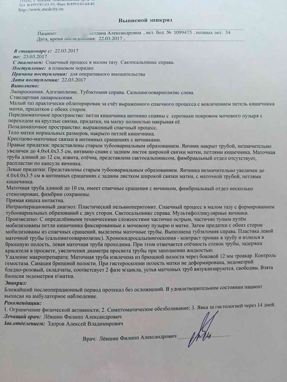 Ну и под конец, сказал, что оставил трубу одну и сделал все же пластику на свой страх и риск. Хотя я просила удалить.. И если на ЭКО она все же будет мешать, то перед подсадкой звонить ему и он абсолютно БЕСПЛАТНО за 15 минут мне её уберёт.