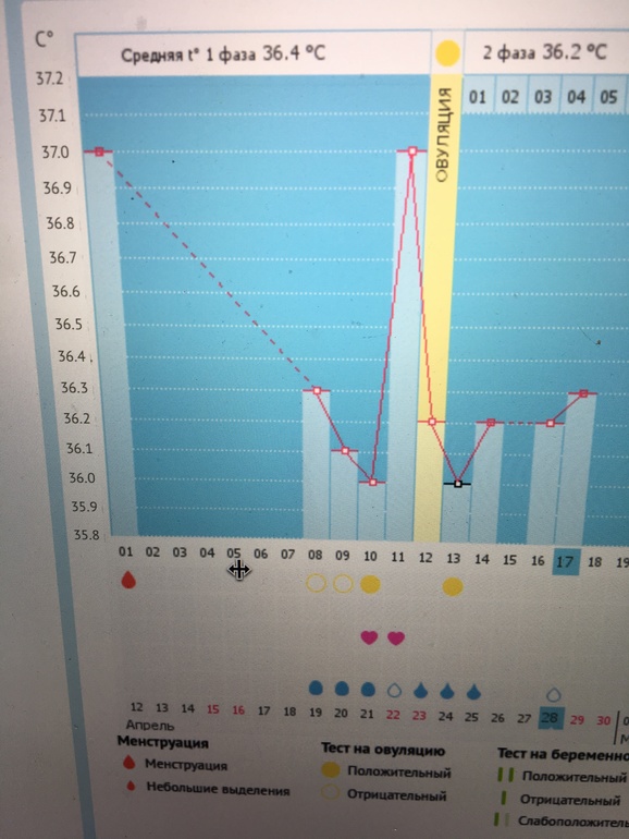 Можете поставить "не учитывать" на 11 дц. Тогда на графике ещё вообще не будет отмечена овуляция. Почему нет сердечек в районе 27 числа? Или просто не ставили?