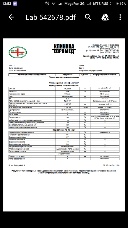 Привет ббшки,вопрос по интерпретации спермограммы.Сдавал муж на прошлой неделе.До этого сдавал обычную без морфологии ещё года полтора назад.Было все отлично.Сейчас смотрю ухудшилась вязкость и количество спремотозоидов в 1 мл.Врача ещё не выбрала,до этого пару раз был у андролога он сказал,что все норм у него.К нему не хочу больше.Можете рассказать может у кого что похожее было,как лечились?