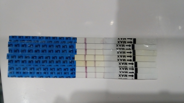 Овуляция( тесты на овуляцию)Девочки, посмотрите пожалуйста, была ли О, как думаете?Полоски, даже самые яркие, светлее контрольной... А потом пошло на спад. Считать ли это овуляцией? 3-тий снизу на 12 дц. Нижний сегодняшний 14 д.ц