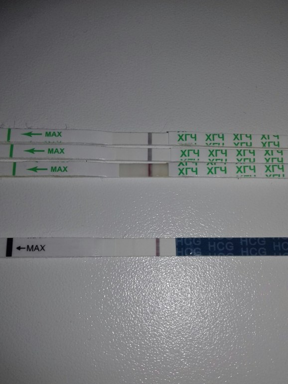 Хорошо, что так... а то кровь при беременности не хорошо и внематочной боялась. Видимо и Я столкнулась с БХБ...полоски на тесте так обнадеживают, сразу планы строишь в голове, а тут раз...1 день задержка, а на второй месячные и тесты слабую полоску рисуют. На второй день месячных на бишурс почти не было полоски, а эвик такую же нарисовал (эви был двойной из голубой коробочки. И тут встречала записи, что они реагент выдают...испортились видимо, кому теперь верить((( Вот такие полоски были :