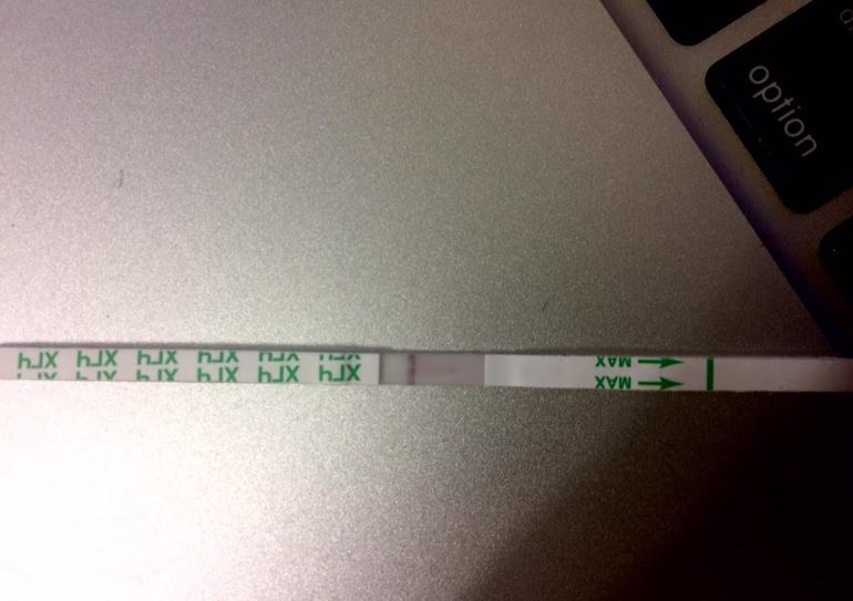 Посмотрите, пожалуйста. Это призрак? Точка на месте второй полосы появилась, это примерно минут через пять после старта теста, но в процессе высыхания почти ушла в невидимомость, но вроде что-то есть, но хз что. Реагент/воображение тоже не исключаю.