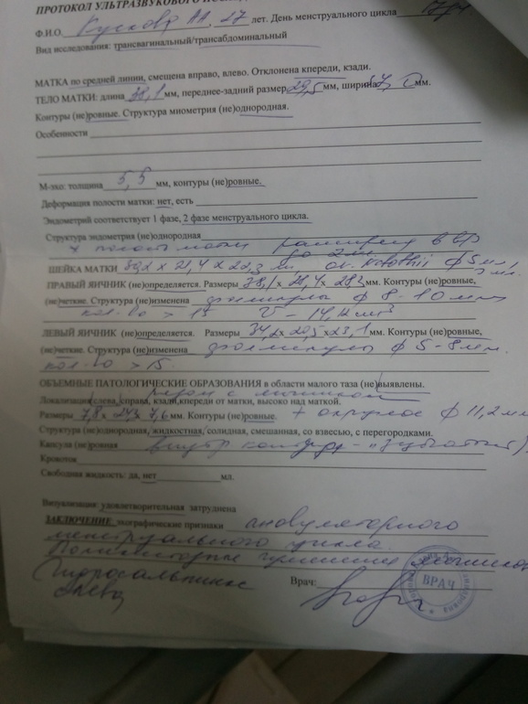 Уже 8-7 лет не могу забеременеть, каждая смена врача, новые диагнозы и результаты УЗИ, похожие на бред. Когда проживала в своём городе 7 лет назад, был бывший м/ч, врач поставил диагноз эррозия, сказала срочно прижигать и менять партнера. Мягко говоря была в шоке. В итоге врача сменила, а потом так получилось, что и молодого человека. В очередной приход в ЖК, с меня взяли на все гормоны в один день, сделали УЗИ, по гормонам уже не помню, а вот УЗИ показало жидкость, кучу спаек и СПКЯ. Врач хотела в этот день положить в больницу, отказалась...пропила полгода регулон, вышла замуж,переехала. Гинеколог в этой Ж/К ставит диагноз мультифолликулярные яичники, увеличены, по гормонам,сдавшимся наконец то два раза, а не всё в кучу, её все устроило, ни спаек,ни жидкости. Далее меня отправили гулять полгода и пить Дюфу. На 4 месяц делаю УЗИ...дважды итог отсутствие овуляции в корне, иду к врачу, она меня посылает на кольпу, всё в норме, онкоцитология тоже в норме. Делаю контрольное УЗИ на 6 месяц после полного курса, спайка, воспаление, жидкость и снова диагноз СПКЯ, эндометрий очень мал и увы месячные так и не приходят, шли только под дюфой. Гиня наконец то сдаётся и записывает в МОННИАГ в Москву, вот поеду 7 числа послушаю что скажут там, грозила лапарой и ЭКО. Дело в том что чувствую я себя нормально, кроме нерегулярных месячных раз в полгода, раз в три-4 месяца, жалоб то и нет. Возможно как то сумбурно написала, но как есть. Прилагаю фото с гормонами, УЗИ наверное нет смысла ибо каждое сделанное мной конкретно противоречит друг другу...