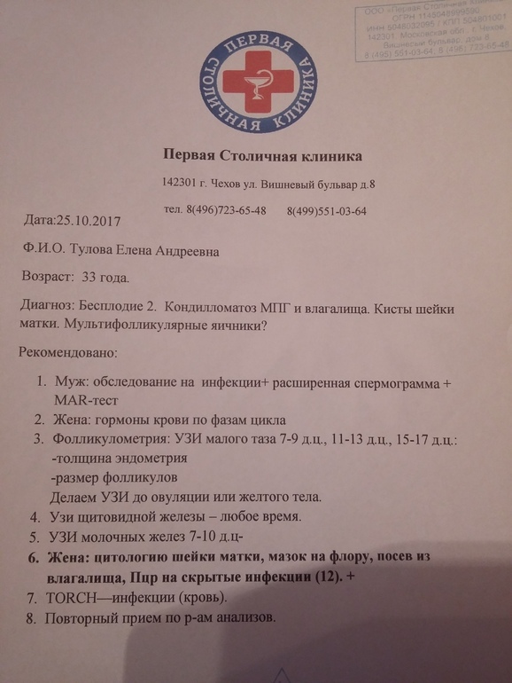 Вот и начинаю свою ПОСЛЕДНЮЮ попытку родить второго ребенка. Решила так, если сейчас этот врач нам не поможет то все, завязываю с этим раз и навсегда. Замучилась я с этим всем. И так что я имею: вчера была у нового своего платного врача. Пока имя озвучивать не буду. Девочки так меня смотрели и рассказывали все первый раз!!!! Сначала мне пришлось вспомнить всю свою жизнь с первого дня месячных))) и потом она рассказала как происходить зачатие (конечно я и так знаю), что может мешать и какие факторы мешают этому фактору (я и так тоже это знаю, но что то открыла для себя нового ) и после начался осмотр на кресле. Я первый раз в жизни увидела свою шейку на экране)))) она включила типо чтотто камеры и все мне показывала (мои кандиломки во влагалище и кисты на шейке после проижигания эрозии и небольшой очаг воспаления на шейке). Она сказала что это все не смертельно. Она смотрела, мою письку (простите ) ооооочень близко, рассматривала тщательно наружные половые органы. Короче такой осмотр я испытывала впервые. В кабинете я провела 1час 20 минут. И даже не заметила как прошло время. Она взяла первые мазки на анализы (за все я заплатила 8750 вместе с приемом) и довольна пошла домой. Вот теперь сижу и жду результаты. Сегодня кстати тест на О у меня улыбнулся )))) постараемся сегодня с мужем (хотя не уверена после 8 лет неудач).и вот что мне надо сделать: