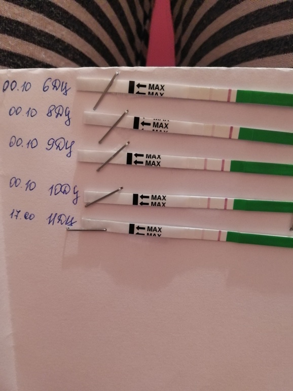 Овуляция( тесты на овуляцию)Цикл 23 дня поэтому начала с 6-го дня делать тесты. Не пойму была ли овуляция или нет? Продолжать дальше мочить тесты? Сегодня уже тест побледнел на 11 ДЦ