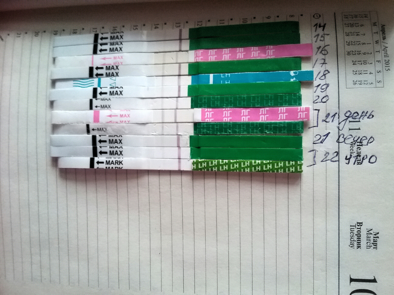 Овуляция( тесты на овуляцию)Привет девчули!!! Давайте помозгуем, цикл 27-29 дней, по графику приложения - овуля 21.03, делала тесты (юзала - Момент чуда, Будьте уверены, Эвитест и Овуплан) - хотела сравнить эффективность /да и на аптеке.ру со скидкой хорошей взяла/. Тесты почти всегда дублировала другой фирмой, оставляла более яркий. На 21.03 тесты пока не высохли были практически идентичны и по яркости, вечером купила Клиаблю и он мне уже не улыбался ((((. Съездила на УЗИ, эндометрий 8 мм, ДФ 15-17 мм в ПЯ (завтра проконтролирую и дополню). Вопрос а был ли всплеск ? Или ждать? Фото под кат