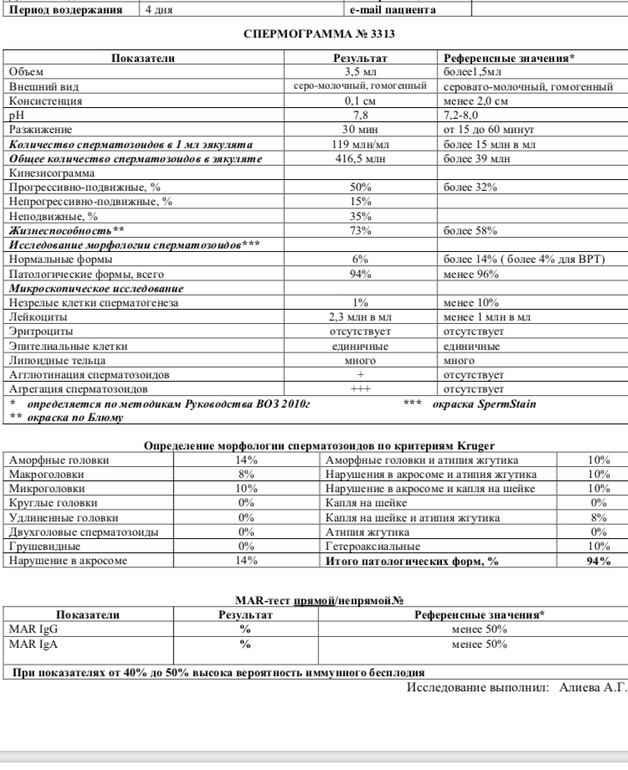 У нас 7 ,в конце заключение:нормоспермия.Андролог сказал:всё хорошо,заниматься сексом через день и после секса лежать час. Не знаю из-за этого или нет, но у нас не получается забеременеть больше года.