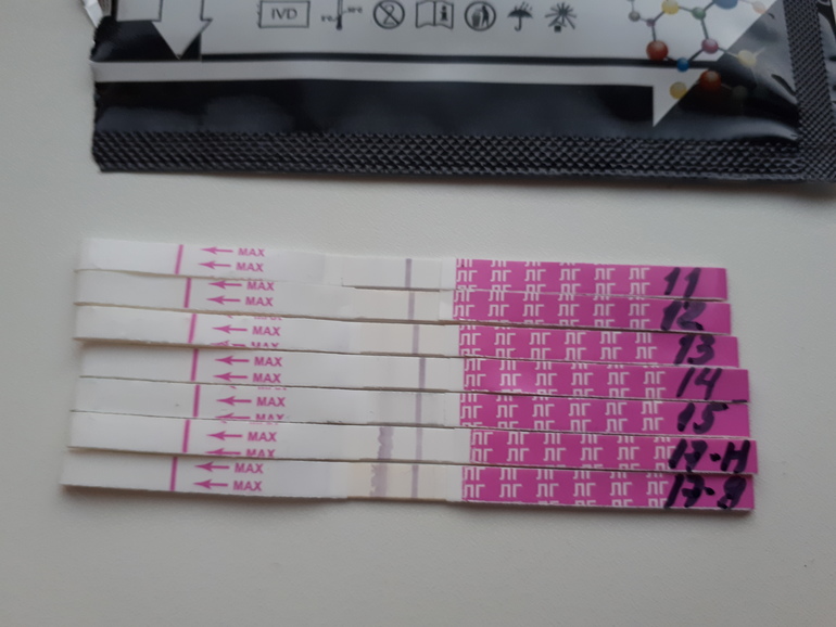 Овуляция( тесты на овуляцию)Здравствуйте, девушки🙂 Делалаю в этом цикле тесты на О Момент чуда. Делала с 11 по 15дц,на 16дц не смогла, получилось только на17дц ночью, примерно в 1час ночи, тест был очень положительный,потом на 17дц днем ок14часов, тест уже рисует не так жирно, но тест все еще положительный. Вопрос: сколько часов может тест показывать положительный результат? Фото тестов: