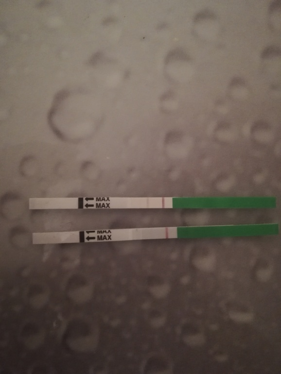 Ну нижний тест у вас еще мокрый. У меня, когда он мокрый, то пустой почти. По мере высыхания ярчает полоска. Оцениваю минут через 10 после того, как замочила.