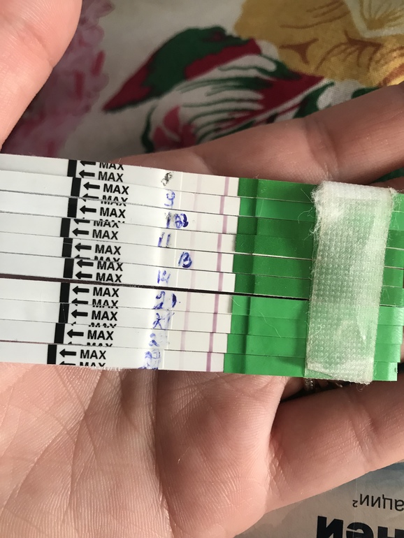 Овуляция( тесты на овуляцию)Девочки холила в этом цикле на узи на 15дц сказали что фолликул 10 см и эндик 4 мм Сказали что бы пришла на 20 дц и может быть овуляция будет , но не факт И было очень много делов и не смогла сделать тесты и сходить на узи , сегодня пошла вроде как мазня Сказом что типо на узи уже не увидят была она или нет По этому цикл в пустую ((( Прилагаю фото как думаете была или нет 8,9,10,11,13,14,21,23,27 -это дни циклов на тесте