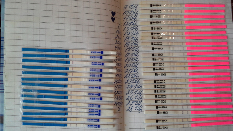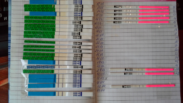 А этот цикл уже веду сейчас. На фото, к сожалению, плохо видно, но вчера и сегодня (еще до дня Х, тесты уже явно со светлыми вторыми полосками. Кстати, последние два дня делала тесты KnowNow с чувствительностью 10 (широкие) и 20 (узкие). Так вот они показывают одинаковые по интенсивности полоски!