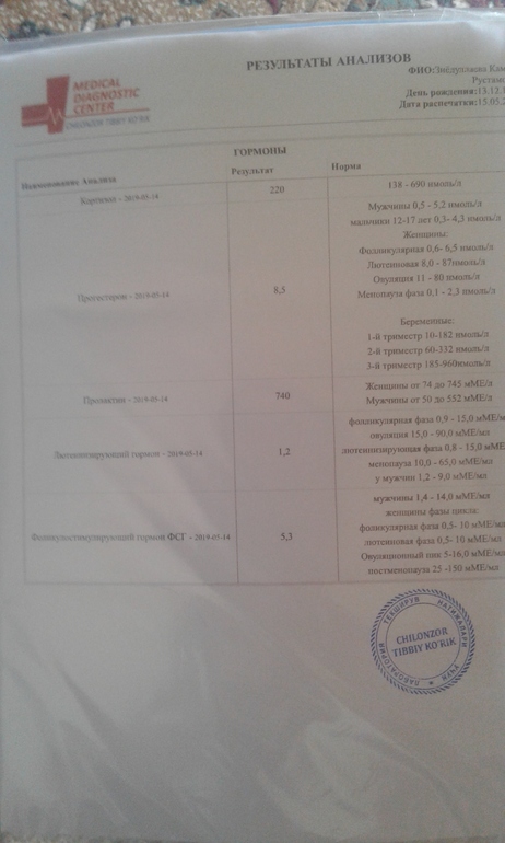 Эстрадиол 0,2 , ттг 0,6, т3 4,5 т4 11,5, антитела к тпо 11, кортизол 220, прогестерон 8,5 пролактин 740 , лг 1,2 , фсг 5.3