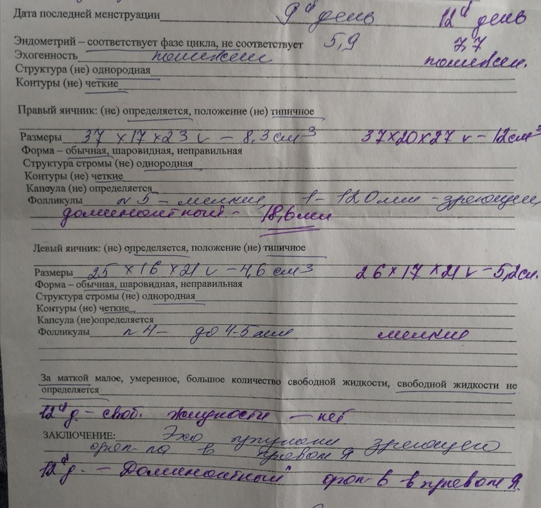 Моя стимуляция была такой с 3 по 7 дц клост по 1 табл, с 8 по 25 дц дивигель 1 мг, на 9 и 10 дц укол гонал ф 5.5, в итоге на 12 дц эндик 7.7, в пр яичнике фолик 18.6 мм, колим хгч 10 тыс ед на 13 дц., утрожестан по 200 мг с 16 по 25 дц. ПА на 14, 15, 16, ну так чтобы наверняка😣Сегодня на 17 дц иду на фоликул и видим непонятно что, говорит врач УЗИ, жидкость не вся вышла из лопнувшего фолликула, но овул была. У кого-нибудь такое было? Что вообще за ерунда такая то😣