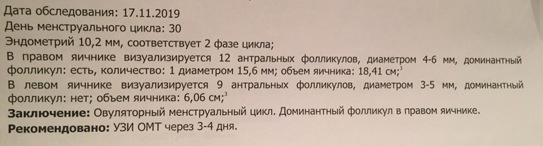 Обнаружили доминантный фолликул в правом яичнике размером 12 мм.