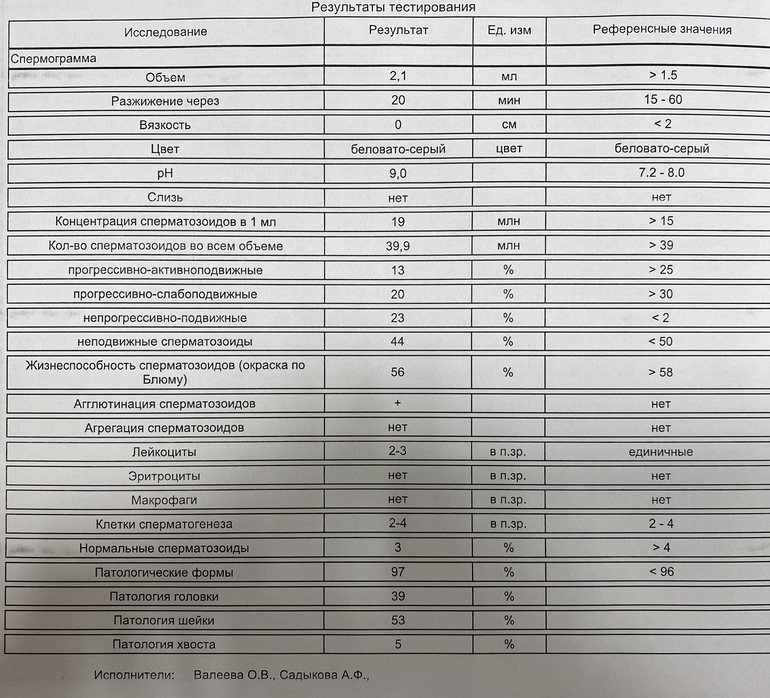 У вас, к сожалению, не очень хорошая Спермаграмма. агглютинация сперматазоидов - это значит, что сперматазоиды между собой склеены, это плохо. И патологические формы 97%, такие сперматазоиды не оплодотворят яйцеклетку Успешно. У вас мужской фактор, записывайте мужа к урологу.