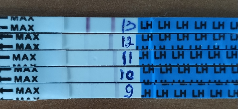 Овуляция( тесты на овуляцию)Думала не будет выброса ЛГ, а тут на тебе, заболела поясница, и яичники, делаю тест, а тут вон какая полоска, можно считать, что овуляция завтра?
