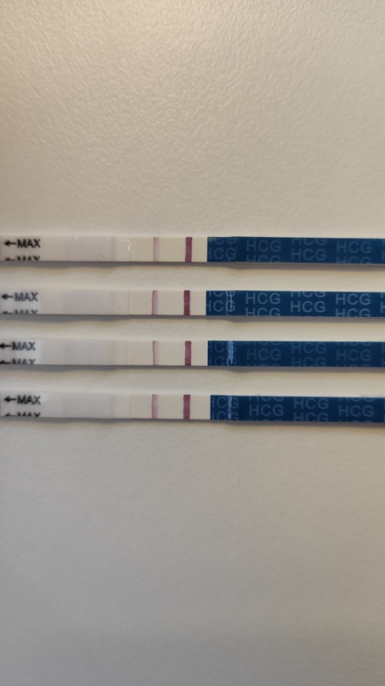мои тесты , сверху вниз:12-13 ДПО, 13 -14 ДПО, 14-15 ДПО, 15-16 ДПО. Пишу двойные цифры, так как тесты на овуляцию были положительные на 16-18 ДЦ. Сегодня 34 ДЦ. И ХГЧ растет слабо и тесты почти на одном уровне.